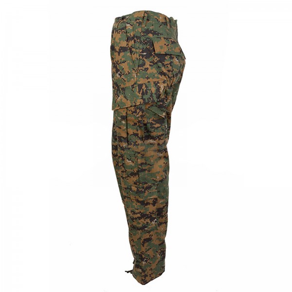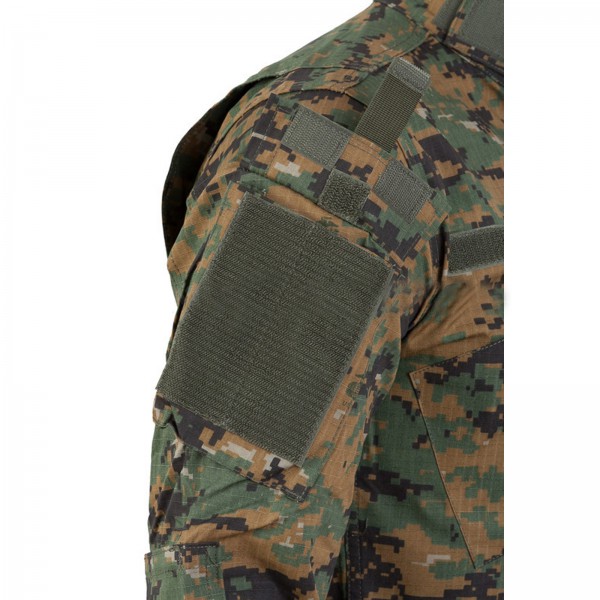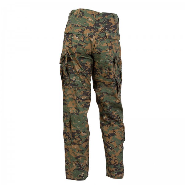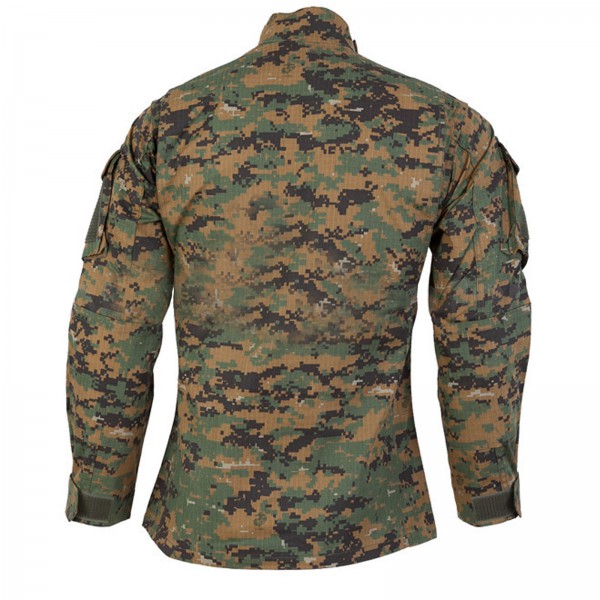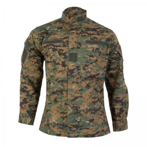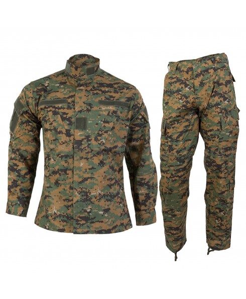 UNIFORME camuflaje Digital Woodland compuesto por chaqueta y pantalón de algodón resistente con doble pespunte. Está equipado con numerosos bolsillos y tiras de velcro para poder aplicar parches con escudos o filas. Este tipo de camuflaje es utilizado principalmente en áreas boscosas con vegetación alta o media.